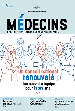 Bulletins de l'Ordre des médecins Imprimer Partager Facebook Twitter Messenger Whatsapp Médecins n°80 Dernière mise à jour le : 26/07/2022 Temps de lecture : 1 mn Lire le bulletin de l'Ordre des médecins de juillet-août 2022 Notamment au sommaire :L'éditorial du présidentLes actualitésLe trombinoscope du Conseil nationalMonkeyox : la stratégie vaccinaleInjection d'acide hyaluronique : un acte réservé aux médecinsCode de déontologie médicale : nouveaux commentaires sur le secret médicalElections : appel à candidature pour l'élection de la chambre disciplinaire nationale de l'Ordre des médecins - Résultat des élections de chambres disciplinaires de première instance Version feuilletableVersion pour mobileTéléc