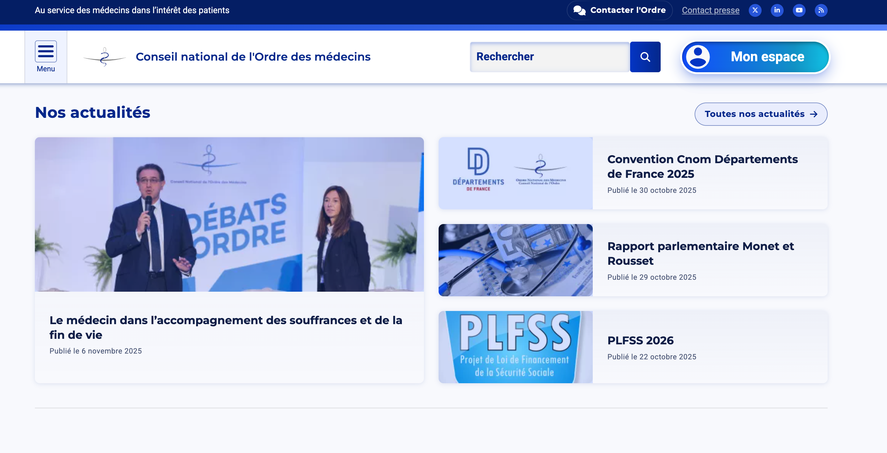 L’Ordre lance son tout nouveau site web, entièrement repensé pour vous offrir une navigation plus fluide, intuitive et rapide. Cette refonte a pour objectif de simplifier l’accès à nos contenus et nos services. L’accès par profil – médecin, étudiant, interne et docteur junior, patient – est direct depuis la page d’accueil, tout comme les documents et démarches types. |