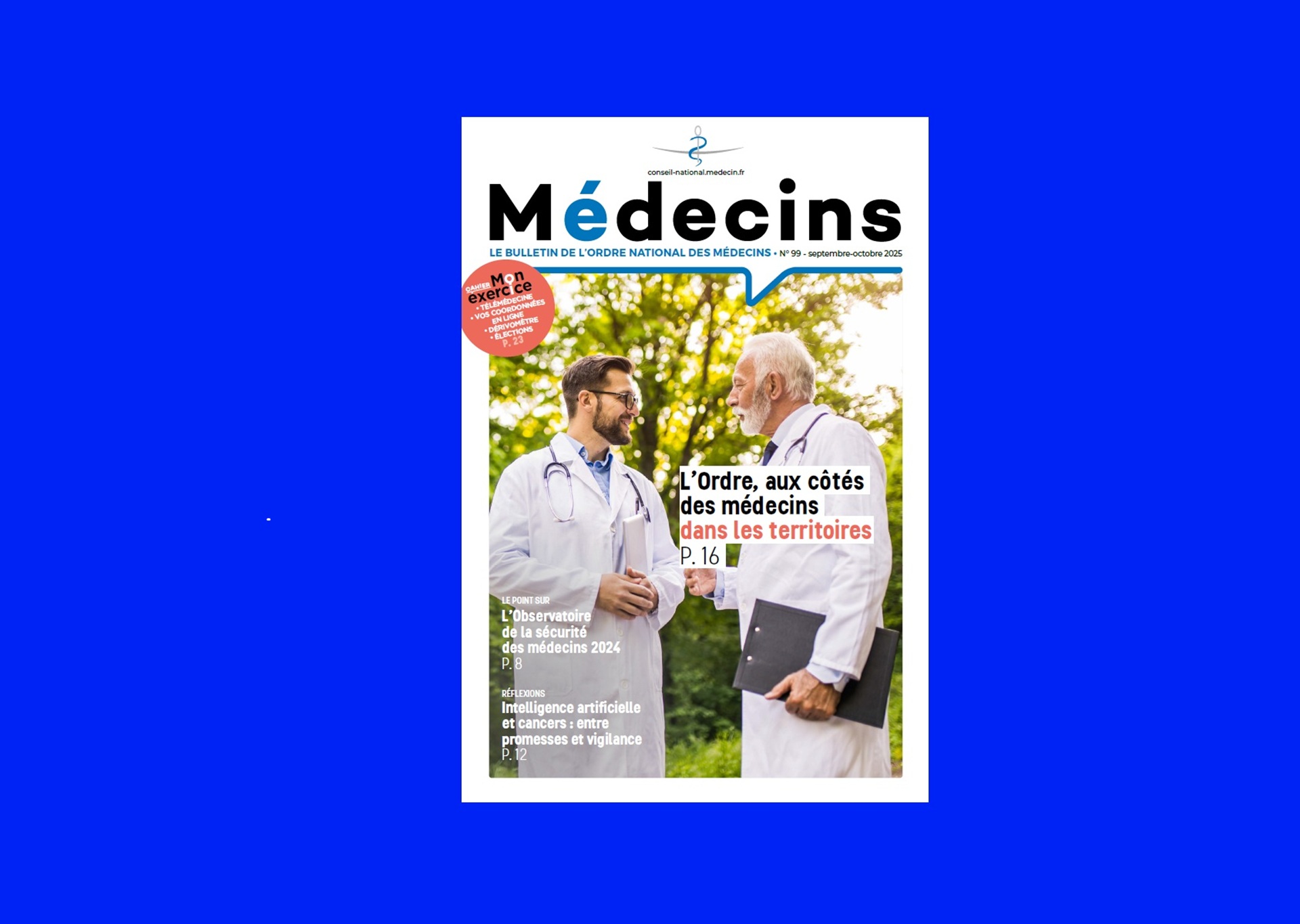 Le dernier bulletin de l’Ordre est sorti ! Au sommaire, retrouvez notamment notre dossier sur les initiatives déployées ou soutenues par les instances départementales et régionales de l’Ordre des médecins dans le Rhône, les Hauts-de-France, la Vienne et la Martinique. Vous pourrez aussi lire une interview croisée sur l’intelligence artificielle utilisée dans la détection et la prise en charge des cancers, ou encore le portrait du Pr Isabelle Laffont, nouvelle présidente de la Conférence des doyennes et des doyens des facultés de médecine. |