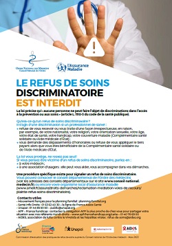 Cette affiche a été réalisée par la Commission d’évaluation des pratiques de refus de soins auprès du Conseil national de l’Ordre des médecins. Elle a une visée pédagogique afin d’informer les patients sur le refus de soins discriminatoire.