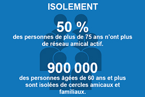 Le vieillissement de la population est en corrélation directe avec la solitude et l’isolement que peuvent ressentir les personnes âgées. En effet, les seniors sont les plus concernés par le veuvage et l’absence de cercle social et amical. 50 % des personnes de plus de 75 ans n’ont plus de réseau amical actif et 900 000 personnes âgées de 60 ans et plus sont isolées de cercles amicaux et familiaux.